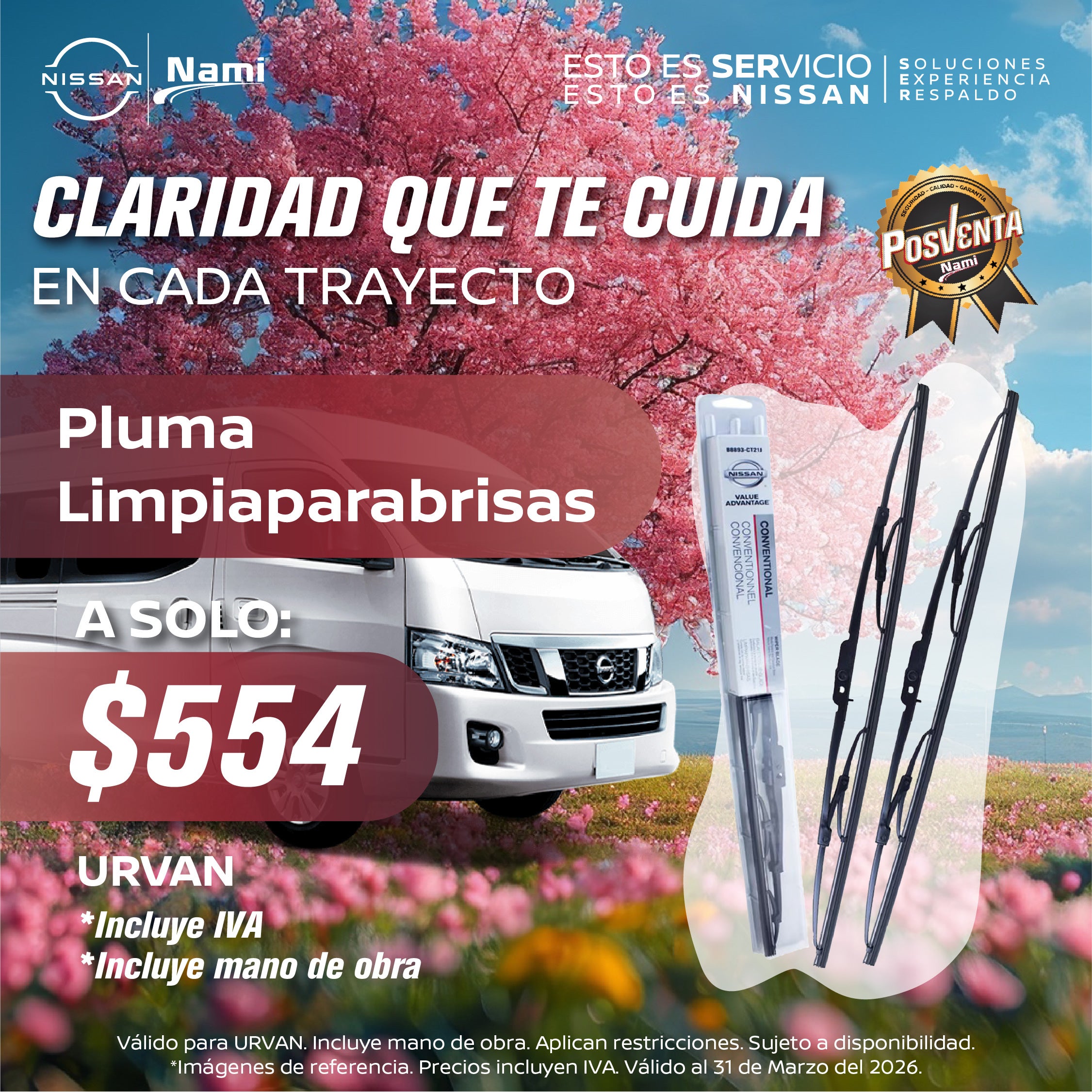 Incluye: Pluma limpia parabrisas, mano de obra. Válido para Urvan.